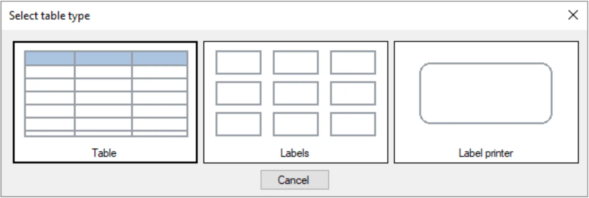 1. To create labels for a label printer with one label per page choose “Label printer”. A table is created with just one table cell fitting the whole page.
