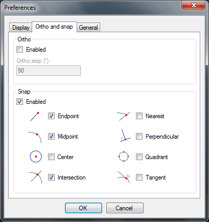 Click the "Ortho" button to activate. It is also possible to activate and deactivate the mode by pressing function key F8. The Ortho settings are made in the "Preference" setup. Right mouse click to start the "Preference" command.