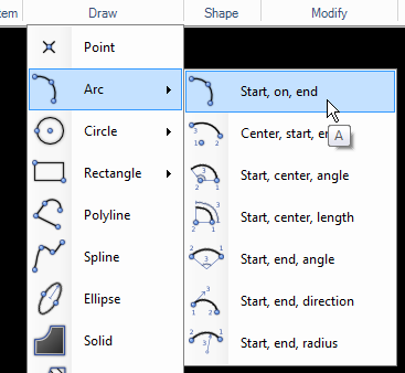 "Arc" entities can be described in seven different ways. The default Arc mode needs input for a 3 point arc (Start, on, end). Six other methods can be used, and will be found by opening the "Draw" drop down menu and by hovering the "Arc" command.