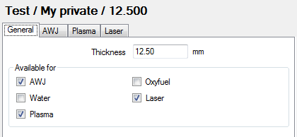 On the general tab change the thickness and control what machine types can be used for this specific material.